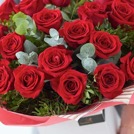Want to woo someone with flowers? This is how you do it. Our artisan florists spiral long-stemmed red roses in the hand to create this magnificent bunch. It's then beautifully gift-wrapped and hand-delivered for a truly magical doorstep moment.