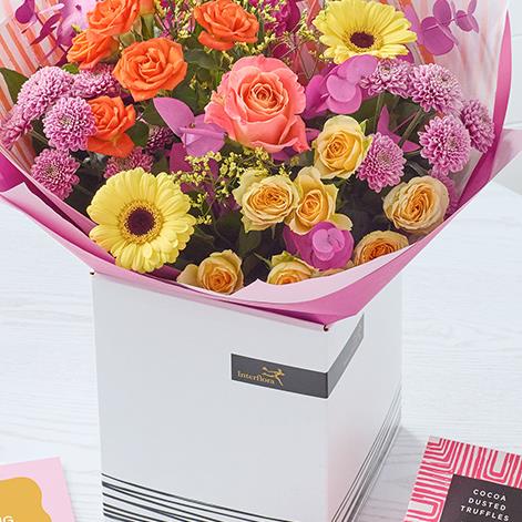A beautifully bright handmade bouquet, plus a selection of scrumptious chocolates and lovely full-sized Mother's Day card.